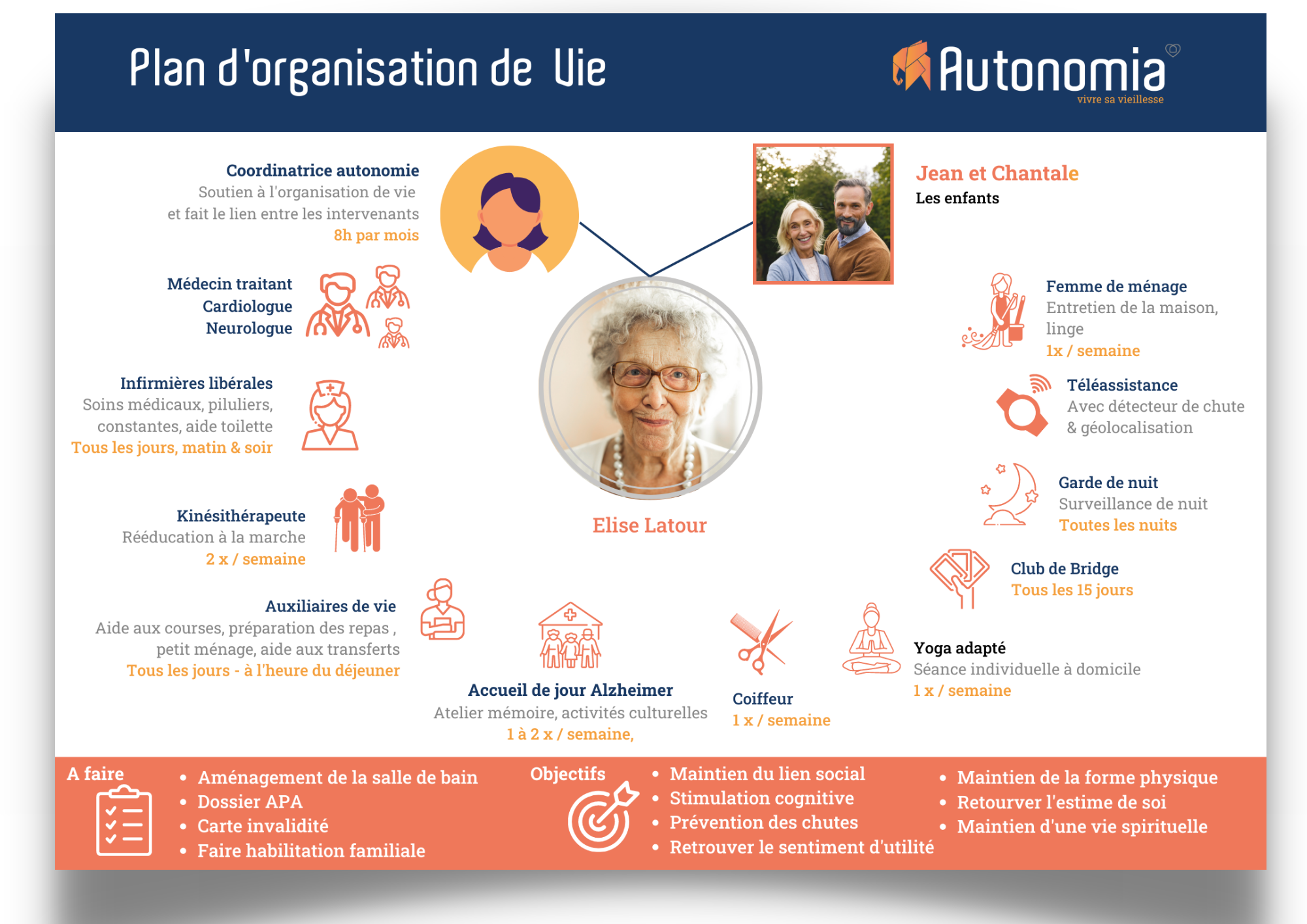 Construit par le Conseiller grâce au Diagnostic 360°, le plan d'organisation de vie permettant la mise n'œuvre des services retenus par l'aidant/l'aidé afin d'assurer une meilleure qualité de vie à domicile.